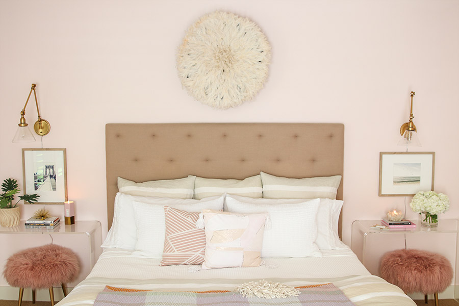 One of my favorite parts of this bedroom refresh is how welcoming our bedroom is at night. After a long day of working and being parents to our two young children, we look forward to relaxing in this room. The glow of the lights against the soft pink walls is truly calming.