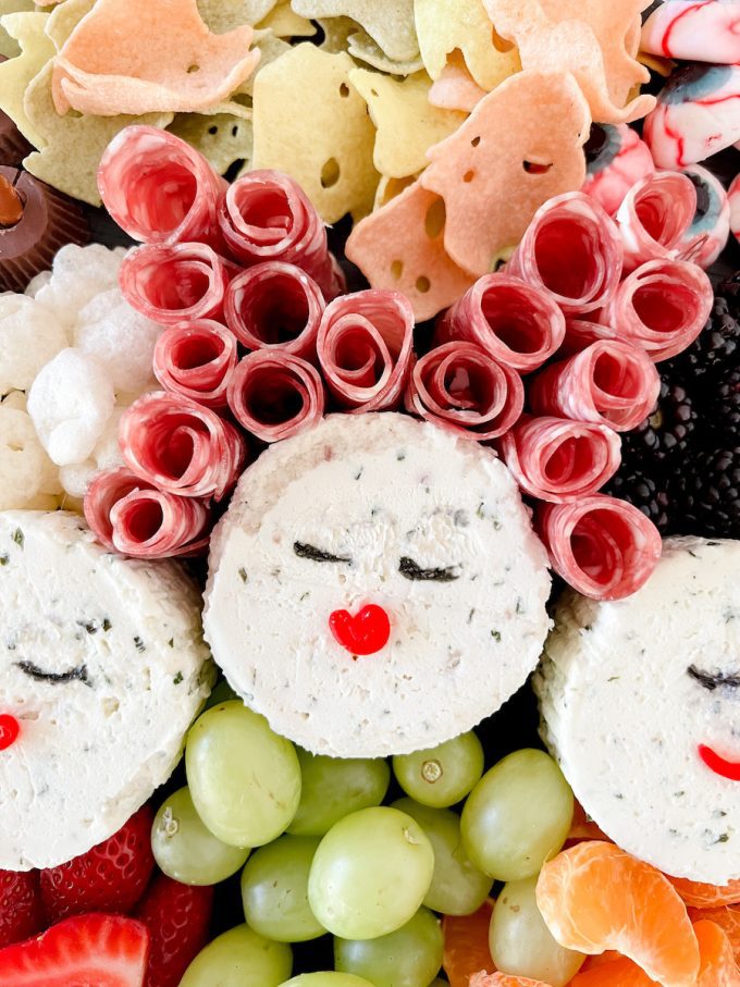 Winifred features salami spirals for her hair. Simply take salami, fold in half and roll up. Place on your board above the cheese in the shape of her hair. For her face, I used a red licorice strand (from a twizzlers pull and peel) and black cake gel icing to draw the eyes.