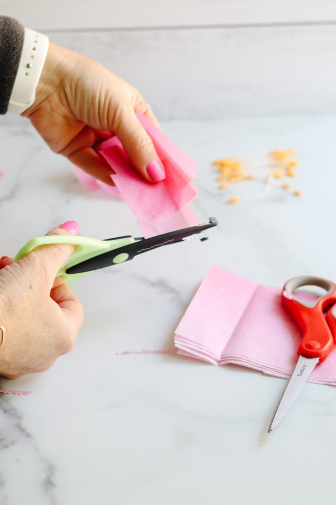 Next, let’s fringe the ends of the tissue paper. Take one short end of tissue paper and cut with your patterned scissors. You can use any irregular scissors for this. This will give the petals a more natural look.