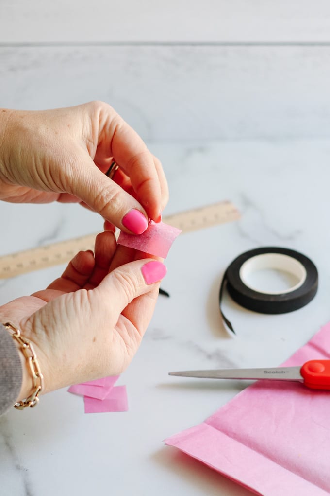 Take 3-4 double ended stamens and fold them in half. Then take one piece of tissue paper and gently pinch the base creating a cup-like petal. Using the floral tape, secure the stamens to the bottom of the petal.